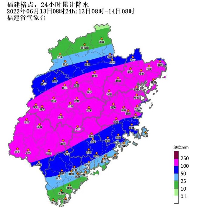 据统计,6月5日08时~13日06时累计83个县的1059个乡镇超过100毫米,其中54个县的277个乡镇超过250毫米,5个县的23个乡镇超过400毫米,以武平桃溪镇489.9毫米为最大。最大小时雨量为仙游游洋镇78.6毫米。